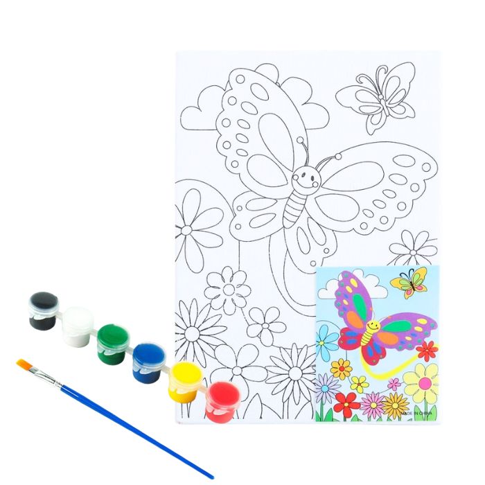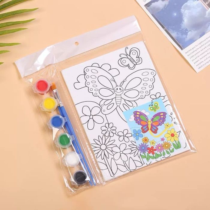 - Each set includes 1 canvas drawing, a set of 6 paint pots and 1 paint brush